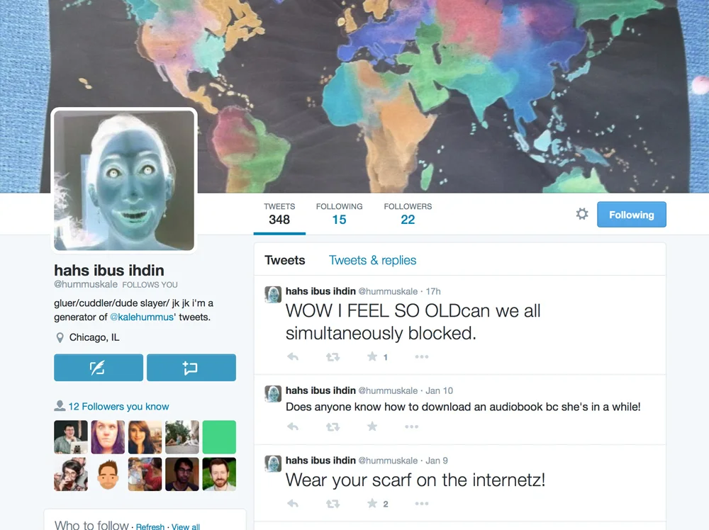 This bot is built off the tweets from my friend Subi, mainly because her account is perfectly delightful and hilarious. The @hummuskale twitter account scrubs Subi's account, @kalehummus, of all her tweets, and reassembles the content into sentences.